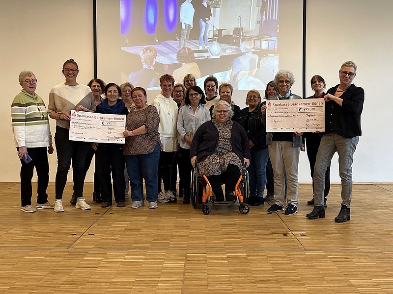 Über den Gesamterlös von 1.375 Euro und Schecks in Höhe von je 687,50 Euro freuten sich besonders Yannik Haggeney von der AWO-Beratungsstelle für Schwangerschaft, Familie und Sexualität und Andrea Brinkmann vom Bergkamener Mädchen- und Frauennetzwerk. Unter anderem sollen die Spendengelder für die Erstellung neuer Flyer beider Einrichtungen genutzt werden.